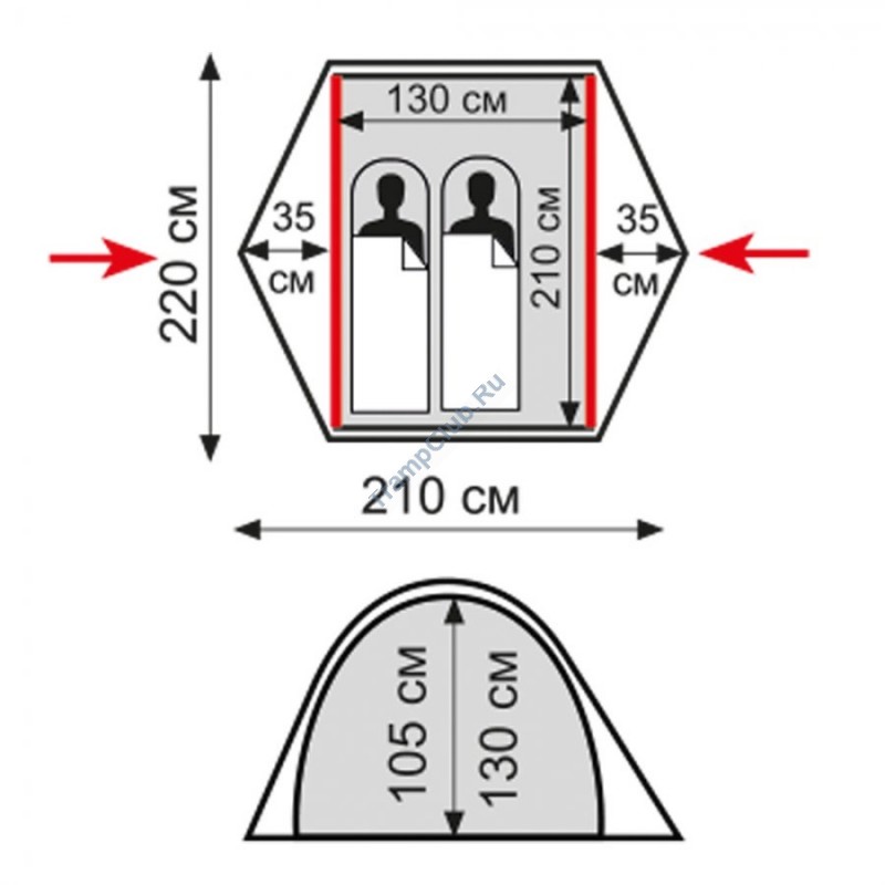 - Двухслойная палатка с двумя входами и двумя тамбурами.