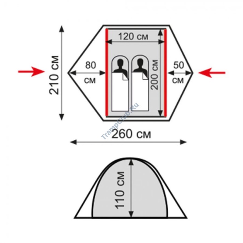 - Двухслойная палатка с двумя входами и двумя тамбурами.
